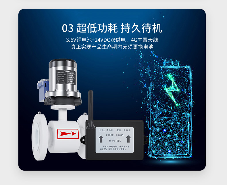 流量转换器为电池供电型转换器,标配一个常规锂电池组,可持续工作 3~6 年。若配用高容量锂电池组,工作时间会更长。