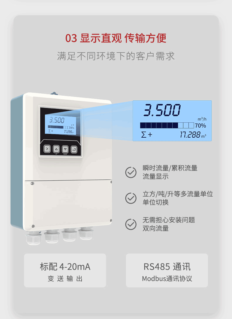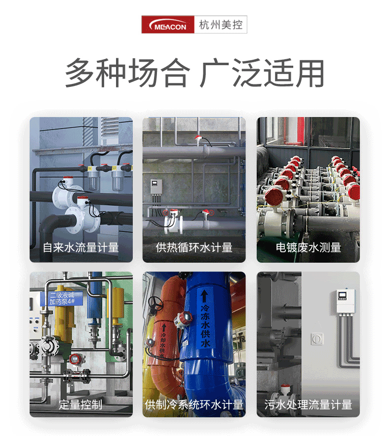 电磁流量计基于法拉第电磁感应原理设计,用于直接测量封闭管道内导电液体的瞬时流量,并具有流量累积功能。在进行现场监测显示的同时,可输出标准的电流信号、脉冲信号和 RS485 数字信号,供记录、调节、控制使用,实现检测自动控制。可广泛应用于自来水、化工、煤炭、环保、轻纺、冶金、造纸等行业。