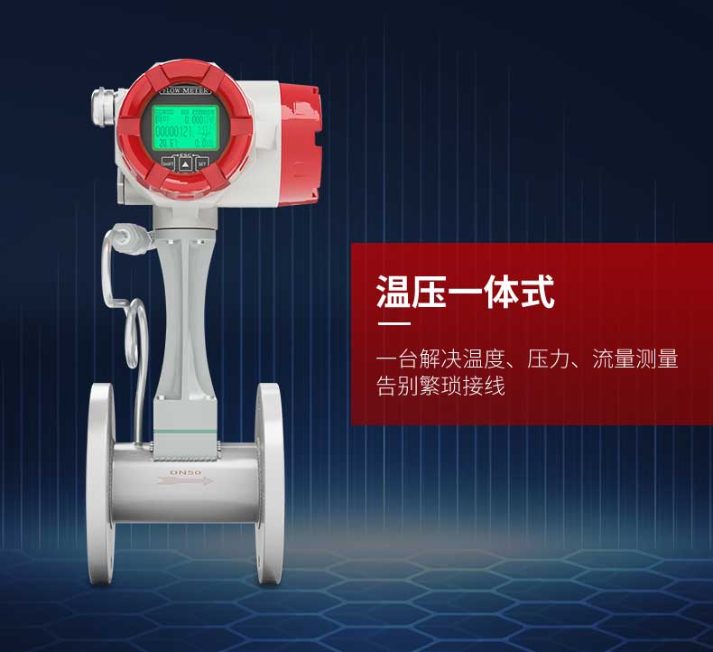 微型涡街流量计结构简单、精确度高、安装维修使用方便,可对管道中的液体流量及温度情况进行实时监控,支持流量和温度(4~20)mA 信号或 485 通信、报警开关输出,并采用 OLED 实时显示流体流量及温度,实现管道当中流量温度一体式的监控功能。本产品广泛应用于石油化工、电力、治金、钢厂、造纸、食口品加工、水处理、电池厂等行业。