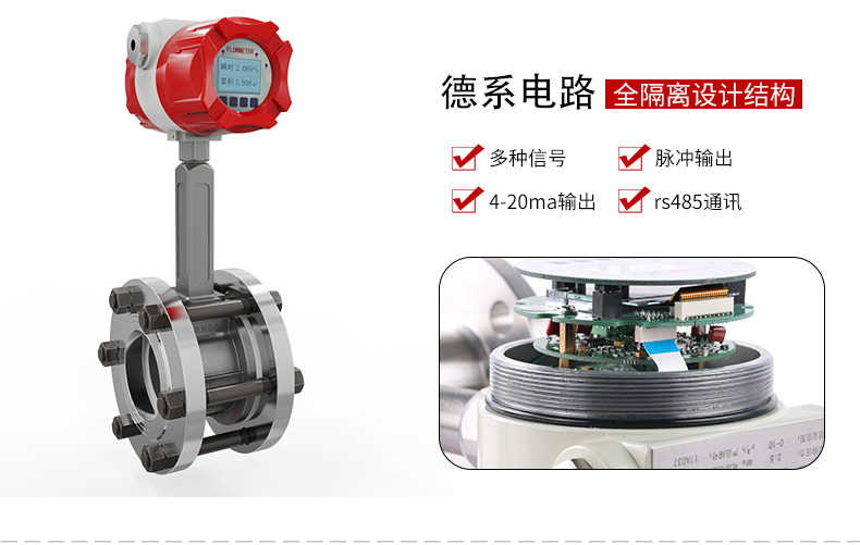 微型涡街流量计结构简单、精确度高、安装维修使用方便,可对管道中的液体流量及温度情况进行实时监控,支持流量和温度(4~20)mA 信号或 485 通信、报警开关输出,并采用 OLED 实时显示流体流量及温度,实现管道当中流量温度一体式的监控功能。本产品广泛应用于石油化工、电力、治金、钢厂、造纸、食口品加工、水处理、电池厂等行业。